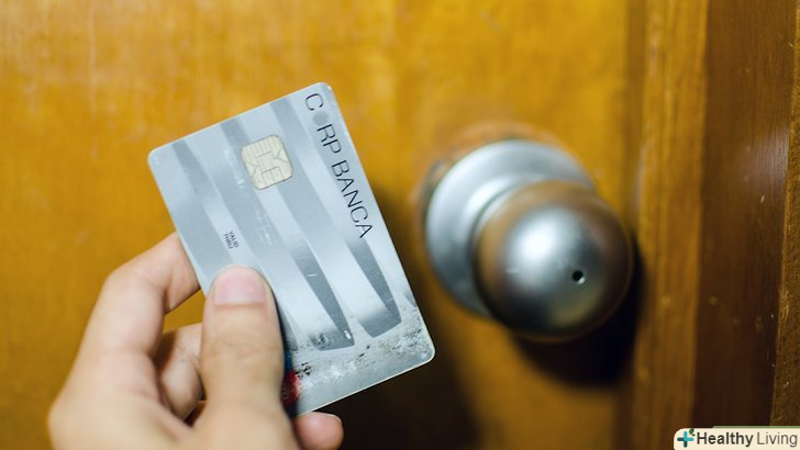 Знайдіть відповідну карту. ідеальною буде пластикова карта, Вона є одночасно жорсткою і в якійсь мірі гнучкою. Не використовуйте свої діючі кредитні або дебетові картки, так як в процесі вони можуть пошкодитися. Ідеальним вибором стане дисконтна карта супермаркету, також як і ламінована Бібліотечна карта. Для деяких замків підійде навіть тверда візитка. [4]- Використовуйте карту для відкриття замку. візьміть карту і просуньте її в проміжок між дверима і косяком. Почніть вище дверної ручки і проведіть картою вниз і всередину. Можливо, вам доведеться трохи посувати її, але якщо пощастить, карта натисне на засувку і дасть вам відкрити двері. [5]