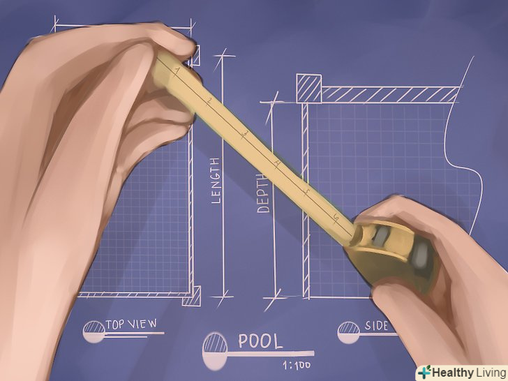 Визначте розмір вашого басейну та кількість галонів (кілолітрів) води в ньому. Виміряйте середню глибину, довжину, ширину та діаметр басейну. Щоб рівняння спрацювало, всі лінійні відстань повинні бути виміряні в футах.- Розрахуйте кількість кілолітрів води, яке міститься в прямокутному басейні. Помножте довжину на ширину на глибину і на 7,5. Наприклад, рівняння для басейну довжиною 10 футів (3 метри), шириною 6 футів (1,8 метра) і глибиною 5 футів (1,5 метра) наступне: 10 x 6 x 5 x 7.5. Такий басейн буде містити 2250 галонів (8,5 кілолітрів) води.