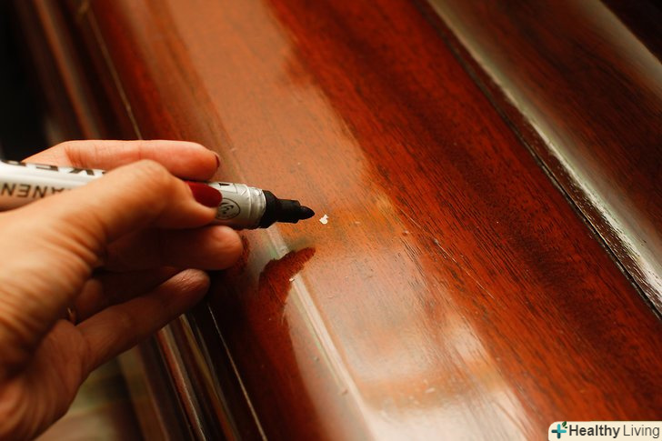 Спробуйте зафарбувати подряпину фломастером з фетровим наконечником. Ви можете знайти такі маркери з різними деревними тонами в господарських магазинах. Наносите маркер безпосередньо на подряпину. Якщо ви потрапили фломастером на неушкоджену поверхню-негайно витріть.- Використовуйте чорний чай, щоб замаскувати подряпини. Не використовуйте трав'яний або зелений чай; саме чорний чай виробляє необхідний колір, щоб відповідати деревині.