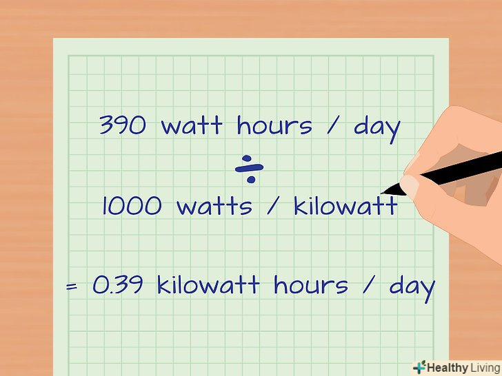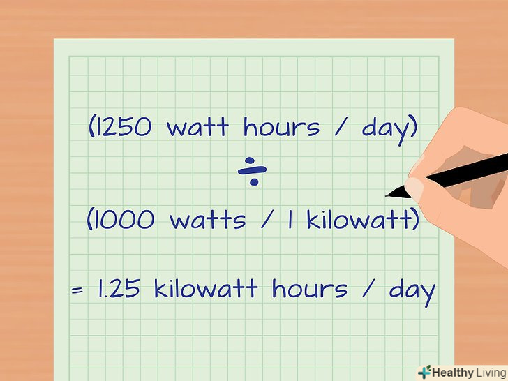 Отриманий результат розділіть на 1000. Так як 1 кВт = 1000 Вт, цей крок перетворює одиниці виміру з Вт∙год в кВт∙год.- У нашому прикладі ви вирахували, що вентилятор щодня споживає 1250 Вт∙год. (1250 Вт∙год) ÷ (1000 Вт) = 1,25 кВт∙год в день.
