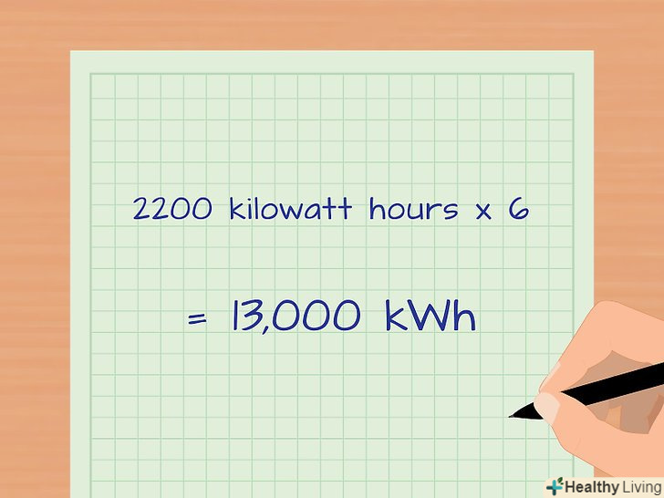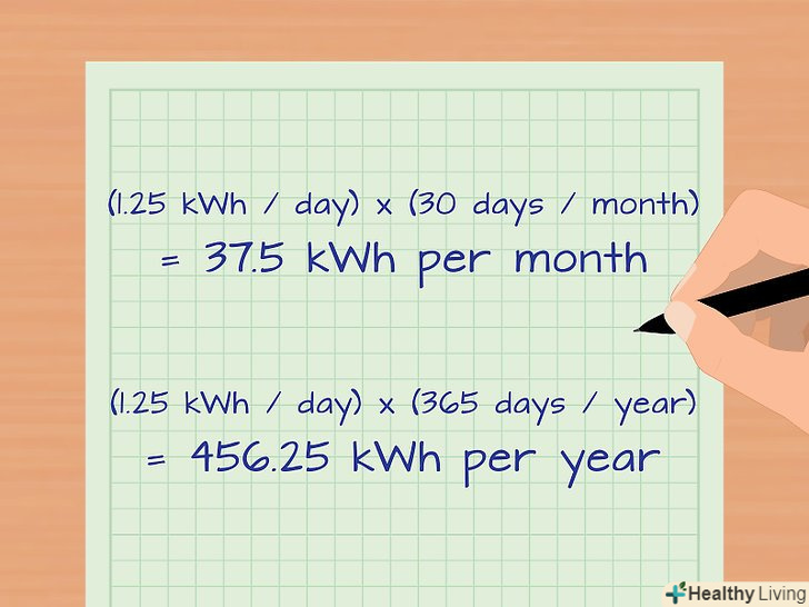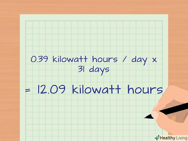 Помножте отриманий результат на певну кількість днів. наприклад, для визначення щомісячної величини споживаної електроенергії помножте щоденне значення на кількість днів в одному місяці.- У нашому прикладі: 0,715 кВт∙год (в день) х 31 день = 22,165 кВт∙год.