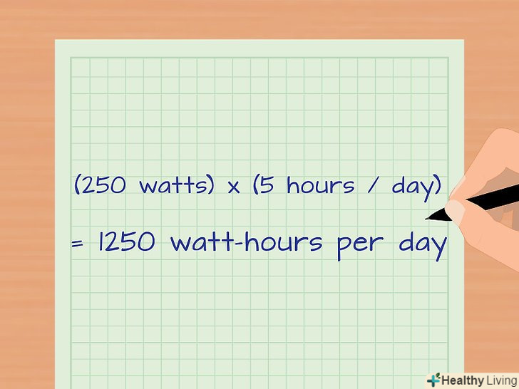 Помножте споживану потужність на кількість годин, протягом яких Ви користуєтеся приладом кожен день. вати-це одиниця виміру потужності безвідносно часу. Помноживши одиницю виміру потужності на одиницю виміру часу ви зможете оцінити кількість споживаної електроенергії і обчислити суму, яку Ви повинні заплатити.- Наприклад, великий віконний вентилятор потужністю 250 Вт працює 5 годин на день. Таким чином, щодня вентилятор споживає (250 Вт) х (5 год) = 1250 Вт∙год електроенергії.