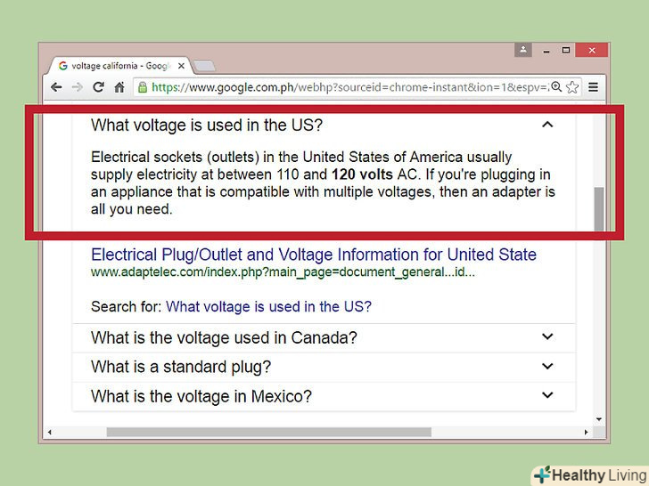 Визначте значення напруги в електромережі вашого регіону. у Росії і більшості інших країн стандартна напруга в електромережі дорівнює 230 В (220-240 В). У деяких країнах (наприклад, в США) ця величина становить 120 в. [4]- У США великі електроприлади, такі як Пральні машини, можуть бути підключені до спеціальних електромереж з напругою 240 В.для з'ясування напруги електроприладу знайдіть його етикетку з енергопараметрами (на етикетці вказано рекомендоване напруга, але можна припустити, що напруга в електромережі, до якої підключений прилад, відповідає цій рекомендації).