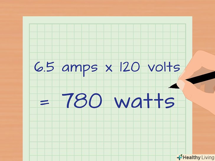 Помножте силу струму на напругу. так ви обчислите значення споживаної потужності, виражене в ватах.- Наприклад, на етикетці мікрохвильової печі зазначено, що сила струму дорівнює 3,55 а, а напруга дорівнює 220 В.Потужність цієї печі дорівнює 3,55 а х 220 В ∙ 780 Вт.