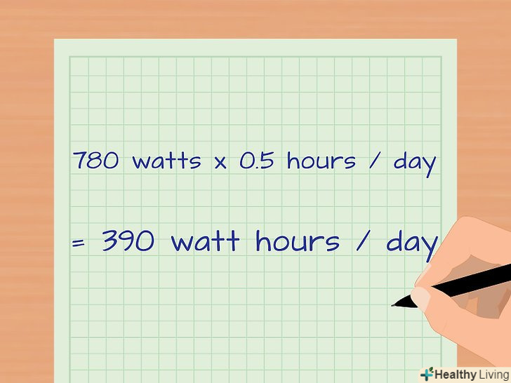 Помножте споживану потужність на кількість годин, протягом яких Ви користуєтеся приладом кожен день. Потужність характеризує кількість енергії, споживану приладом під час його роботи. Помножте споживану потужність на середню кількість годин, протягом яких прилад працює щодня.- У нашому прикладі мікрохвильова піч щодня працює протягом 30 хвилин. 1430 Вт х 0,5 год / день = 715 Вт∙год в день.