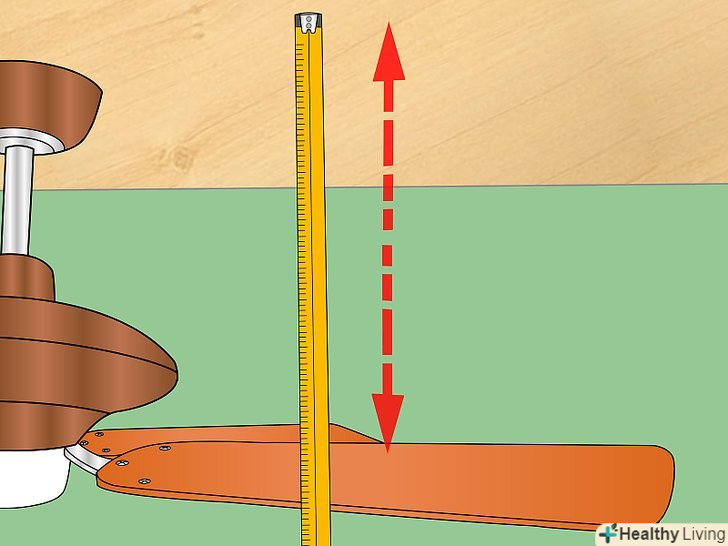 Виміряйте збалансованість лопатей. лінійкою або за критеріями виміряйте відстань між кінцем кожної лопаті (найдальша точка від маховика) і стелею. Виміряйте кожну лопать. [1]- Якщо деяка відстань трохи більше, ніж інші, спробуйте загнути його м'яко, вгору або вниз, там, де лопать закріплена. Будьте обережні, щоб не штовхнути або не замкнути що-небудь, що прикріплено до маховика. Просто трохи Натисніть, щоб вирівняти лопать.