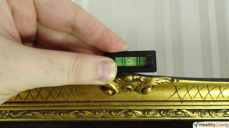 Скористайтеся рівнем, щоб визначити чи важить картина рівно. покладіть рівень на верхню сторону рами. Якщо бульбашка в рівні знаходиться посередині, то картина підвішена рівно. Якщо бульбашка перемістився в одну зі сторін, то вирівняйте картину, щоб бульбашка був посередині.