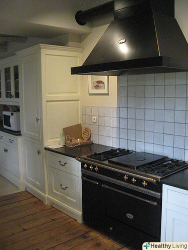 Підготуйте місце для роботи . Якщо під витяжкою знаходиться електрична плита, то її краще відсунути. Газові плити зазвичай занадто важкі, щоб зрушити їх і не пошкодити підлогу. Незалежно від типу плити, завжди стежте за довжиною мережевого шнура і гнучкого газопроводу. Електроплити часто оснащуються мережевим шнуром, який просто виймається з розетки. Тоді як відключення газових плит від газопроводу може виконуватися тільки ліцензованим фахівцем. Багато нових газових плит і духовок також підключені до електричної мережі за допомогою шнура.- Огляньте ділянку безпосередньо над витяжкою. це може бути підвісна шафа або інший кухонний елемент, що дозволяє отримати достатню кількість інформації про спосіб кріплення, а також підключення витяжки до мережі і витяжній трубі (тільки відвідні витяжки).