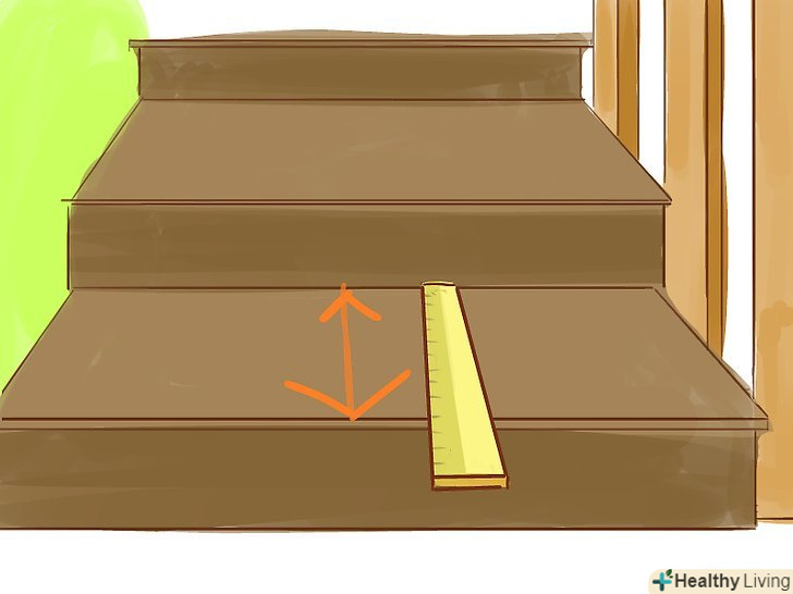 Виміряйте розмір ступені по ширині від місця, де вона стикується з подступенком (вертикальною частиною), і вниз уздовж подступенка до його початку.- Для цього вимірювання, невже визначити меншу відстань ступені в напрямку протилежному першому виміру. Значення цього вимірювання включає в себе висоту сходинки. Якщо край сходинки виступає над подступенком, необхідно спочатку виміряти глибина виступу, а потім спускатися далі вниз.