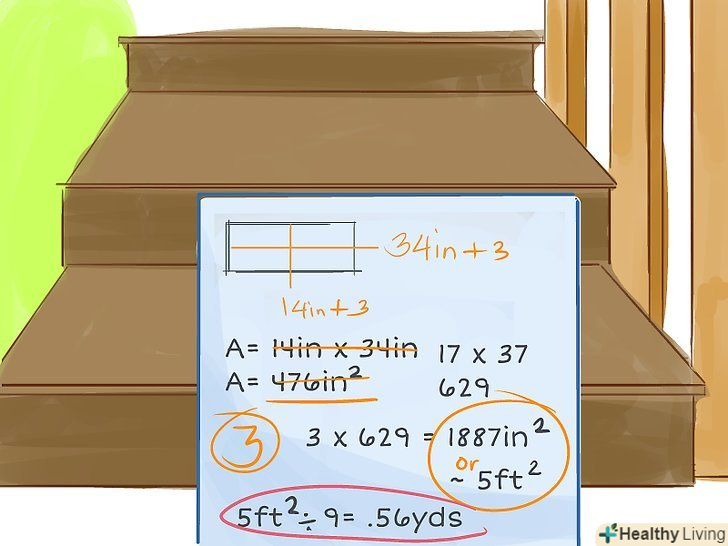 Помножте площу однієї сходової сходинки на кількість ступенів. це буде загальна площа сходів, яку ви плануєте застелити килимом.