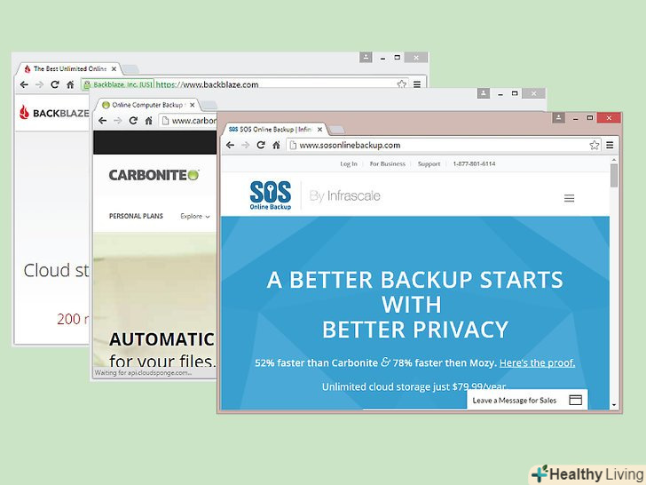 Знайдіть надійний онлайн сервіс резервного копіювання.такі сервіси дозволяють користувачам зберігати резервні копії даних на віддалених серверах. Автоматичне створення резервних копій гарантує вам цілісність ваших даних, а їх зберігання на віддалених серверах – можливість доступу до них з будь-якого комп'ютера, підключеного до Інтернету. Ось опис декількох таких сервісів:- Backblaze-пропонує необмежений розмір сховища за невелику щомісячну оплату.