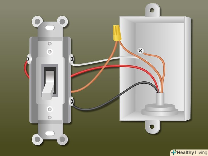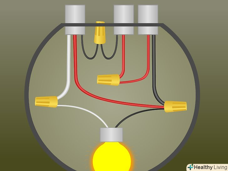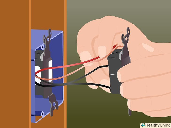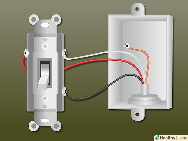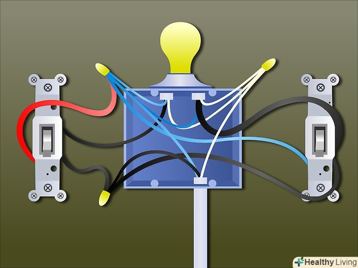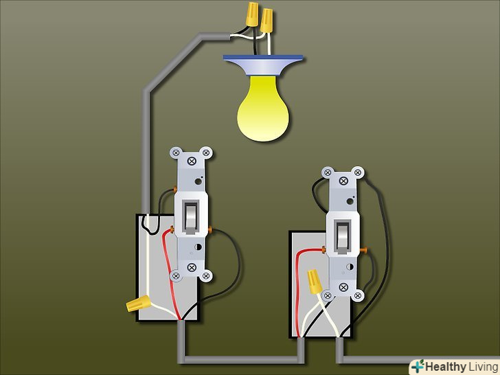 Приєднайте 3-жильний кабель в першому вимикачі, який входить зверху вимикача. червоний ізольований провід приєднується до одного з двох невикористовуваних терміналів (показані на зображенні зверху на верхній лівій і правій сторонах обох 3-сторонніх вимикачів). Не має значення, до якого з гвинтів цей провід приєднаний.- Приєднайте чорний ізольований дріт до решти терміналу вимикача.