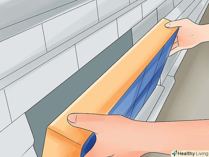 Заповніть вільні місця в нижній частині розчином. використовуйте кельму і Заповніть порожні місця навколо прокладок в нижній частині панелі. [9]- Дайте йому міцно схопитися і затвердіти перед нанесенням розчину на бічні частини. З внутрішньої сторони зішкребіть згустки розчину кельмою або кельмою. [10]