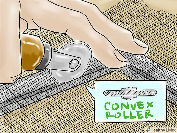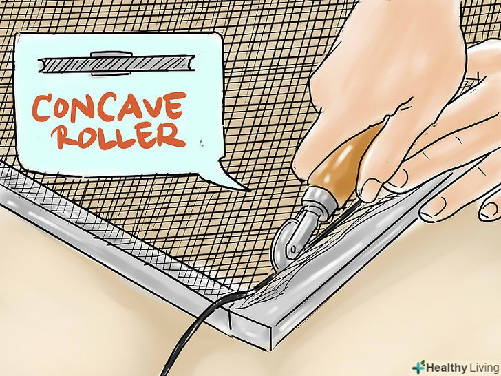 Остаточно втисніть гумовий шнур в канавки роликом з виїмкою, коли сітка вже буде натягнута на рамку. Прокатайте ролик по всіх чотирьох сторонах рамки, розправляючи шнур.- В якості альтернативи (при використанні пластикової сітки) можна відразу розгортати шнур роликом з виїмкою, замість двох окремих етапів (розкачати ж шнур на алюмінієвій сітці в один етап буде вкрай важко).