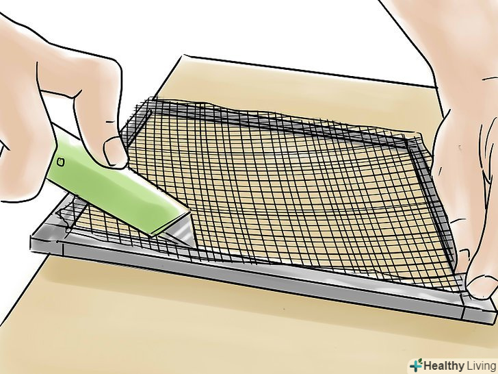 Злегка натягніть сітку (спочатку в довжину, а потім в ширину), не перекошуючи раму і не створюючи хвиль на самій сітці.