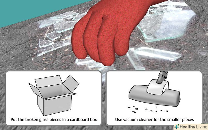Позбавтеся від розбитого скла.- Використовуйте захисні рукавички і видаліть осколки. Покладіть їх у картонну коробку або міцний паперовий пакет.