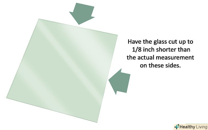 Сходіть в найближчий будівельний магазин і попросіть там порізати скло. замінне скло повинно підходити за розміром від «полички» верхнього краю до нижнього досить щільно, але повинен бути залишений зазор на випадок розширення або стиснення скла, тому відріжте скло менше на 1/8" (3 мм) зверху і з одного боку.