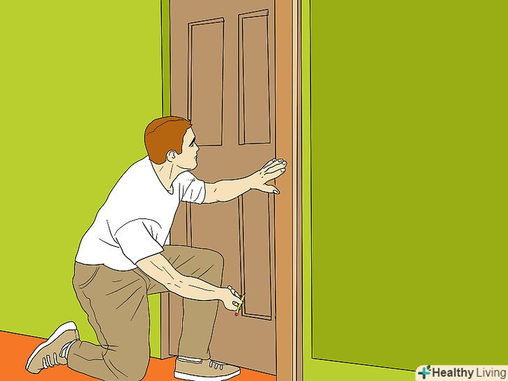 Зробіть позначки для обрізання дверей. використовуючи олівець, нанесіть позначки на однаковій відстані з обох сторін дверей, щоб не відрізати занадто багато з одного боку. Таке неправильне рішення може привести до того, що двері буде виглядати ширше з одного боку. Повторіть цю процедуру для верхньої та нижньої частин дверей.
