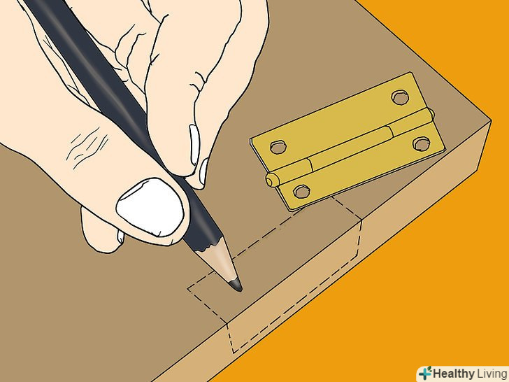 Позначте петлі. слід пам'ятати, що стрижень петлі знаходиться на стороні, де двері буде відкриватися на себе. Якщо ви замінюєте старі двері, потрібно встановити петлі там, де вони були раніше. Якщо ви встановлюєте нові двері, переконайтеся, що вимикачі знаходяться з боку замку в легкодоступному місці. Позначте верхню петлю на відстані 15 см нижче верхньої частини дверей, а нижню-на відстані 20 см вище нижньої частини. Петлі потім слід встановити на внутрішній частині цих 15-20 см відміток. Використовуйте олівець, щоб обвести петлю.