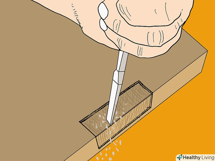 Виріжте пази для петель. за допомогою стамески, поклавши двері на бік, акуратно витягніть надлишкову деревину на необхідну глибину. Якщо ви раніше не використовували стамеску, будьте обережні, Тримайте всі частини тіла, за її ріжучої стороною. Крім того, існують статті про те, як використовувати цей інструмент безпечно. Інший метод полягає у використанні для врізки петель фрезера, що набагато швидше і якісніше. Просто встановіть глибину фрезерування, виріжте деревину вертикальним фрезером і згладьте кути стамескою.
