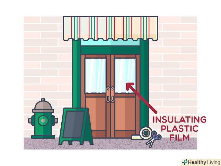 Наклейте на дверні вікна теплоізоляційну пластикову плівку. захист дверних вікон також має велике значення в цьому проекті. Наклейте в два шари двосторонній скотч по периметру рамки вікна. Приблизно через 15 хвилин зніміть підкладку скотча і потім притисніть теплоізоляційну пластикову плівку. [7] також можна купити теплоізолюючу пластикову ленку, на яку вже попередньо прикріплена клейка стрічка.- Теплозоляційні якості покращаться, якщо між пластиковою плівкою і вікном залишити прошарок повітря.