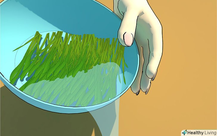 Промийте паростки пшениці. Так як ви вирощували паростки пшениці з органічних насіння в органічному грунті, їм не буде потрібно надмірне очищення. Злегка прополощіть, щоб змити сміття і пил, які могли потрапити на них з повітря.