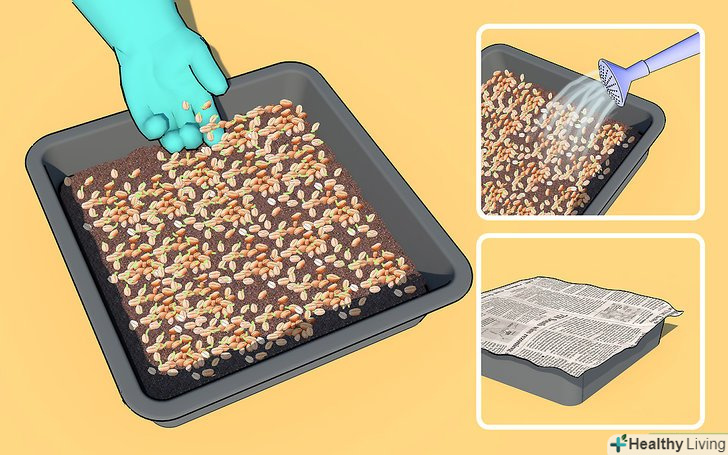 Підготуйте лоток для посадки насіння. викладіть лоток паперовими рушниками, щоб запобігти проростання коренів паростків крізь отвори в дні лотка. Викладіть дно лотка 5 сантиметровим шаром органічного компосту або грунту.- По можливості, використовуйте паперові рушники, які не були оброблені хімічними речовинами або барвниками. Перероблені, що не містять хімічних речовин паперові рушники можна придбати в магазинах здорового харчування.