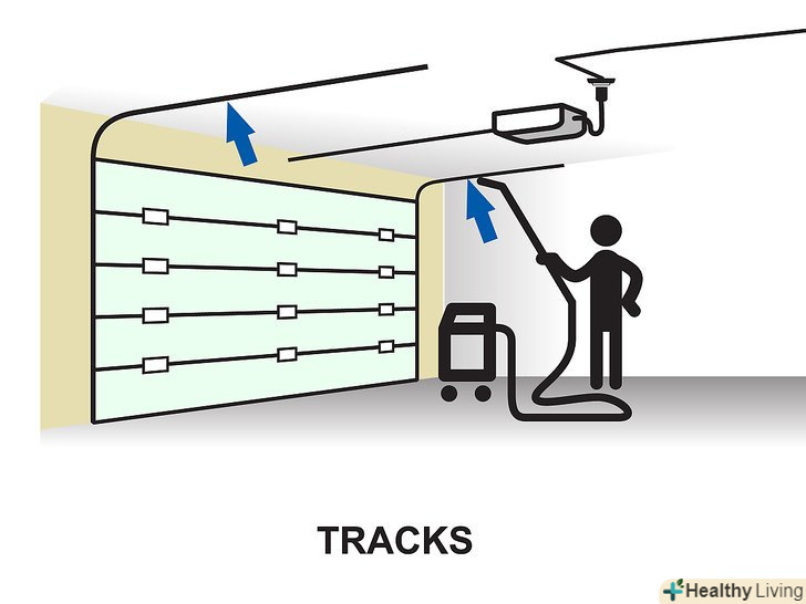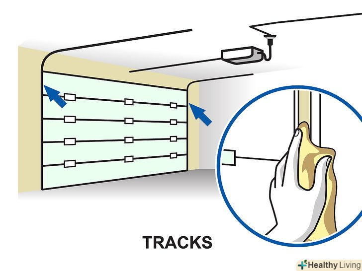 Очистіть доріжки вологою ганчіркою. доріжки – це напрямні, по яких на роликах двері гаража відкриваються і закриваються. Змащувати їх не потрібно, досить якісно їх очистити для того, щоб двері функціонували належним чином. Протріть внутрішню поверхню обох доріжок і приберіть весь накопичилася сміття і бруд. [3]- Переконайтеся, що ви повністю очистили доріжки від забруднення — якщо в них залишиться сміття, то в ньому можуть застрягти ролики.