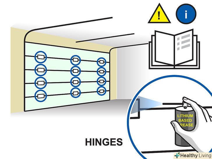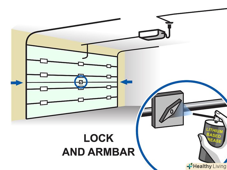 Відкрийте двері і розпиліть мастило на кожну з петель. повільно вручну піднімайте двері гаража, розпилюючи спрей на петлі в тих місцях, де доріжки повертають. Так мастило проникне в рухомі частини, і двері гаража будуть відкриватися і закриватися більш плавно. На кожну з петель використовуйте один-два натискання спрею. Петлі повинні бути повністю покриті мастильним матеріалом. [6]