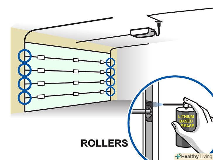 Змастіть ролики. Ролики-це круглі рухливі елементи на двері гаража, які прикріплені до кожної з петель. Усередині цих роликів знаходяться маленькі Шарикопідшипники, які потрібно змащувати, щоб двері відкривалася і закривалася плавно. Скористайтеся розпилювачем з тонкою насадкою, щоб нанести мастило всередину роликів. Витріть зайву мастило, щоб запобігти розбалансуванню дверей. [7]- Всі відкриті Шарикопідшипники потрібно ретельно змастити.