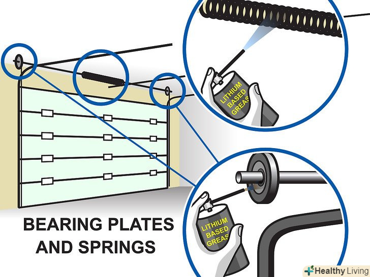 Розпилюйте спрей на зовнішні пружини та опорні Пластини. Пружини знаходяться у верхній частині гаражних воріт, і їх також потрібно повністю змастити. Опорні Пластини являють собою рухомі кругові деталі з обох сторін пружин. Розпиліть спрей на пружини з зовнішньої сторони і біля центру опорних пластин, потім відкрийте і закрийте двері гаража, щоб рівномірно розподілити мастило. [8]- Щоб дістатися до пружин і опорних плит, вам, швидше за все, знадобиться драбина.