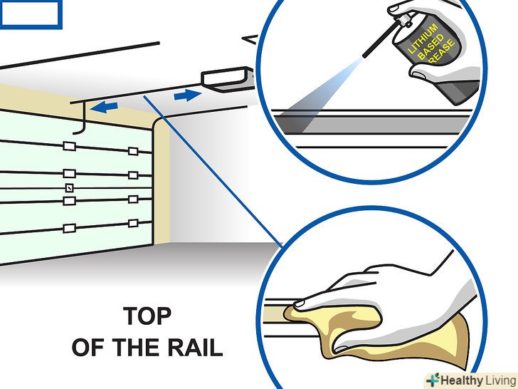 Змастіть верхню частину направляючої. напрямна знаходиться на стелі гаража. По верхній направляючої проходить ланцюг і її потрібно змащувати. Розпиліть спрей на верхню частину направляючої, а потім рівномірно розподіліть мастило за допомогою ганчірки. [10]- Ланцюги не потрібно регулярно змащувати, тому що на них вже нанесені натуральні захисні засоби.