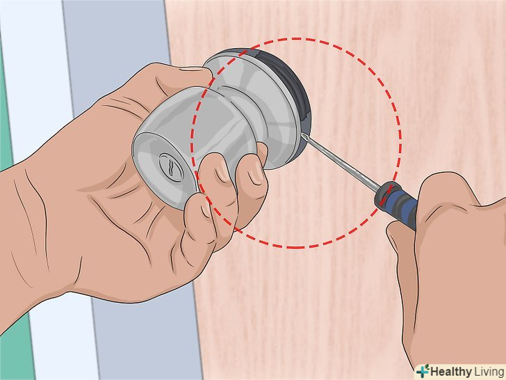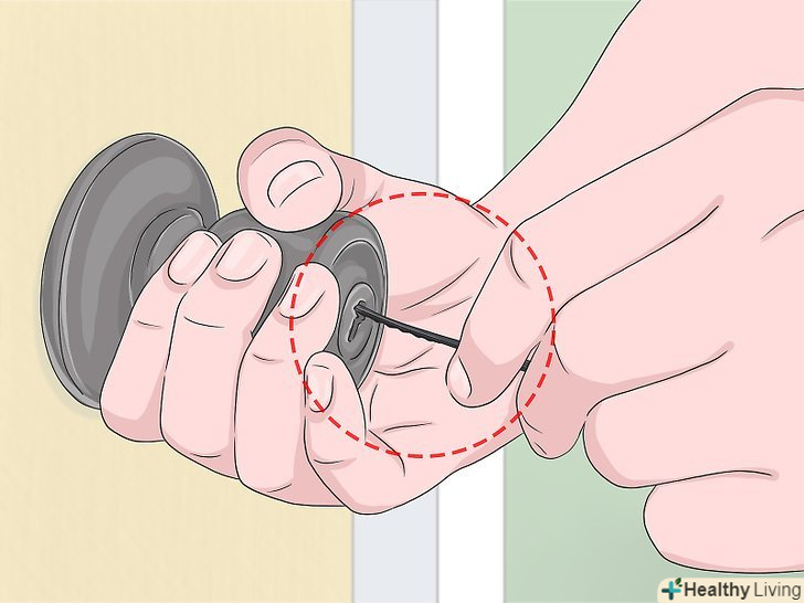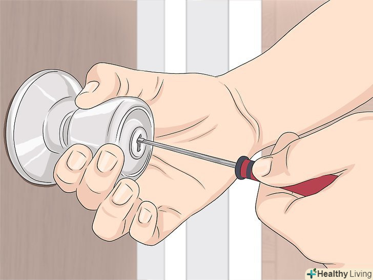 Якщо не виходить розкрити замок жодним із способів,Зніміть дверну ручку . Якщо ви бачите шурупи, якими ручка кріпиться до дверей, викрутіть їх дрилем або викруткою. Потім вставте в замок на дверній ручці викрутку і обережно поверніть її, щоб відкрити двері. [5]- Якщо шурупи не видно зовні, вставте викрутку з плоским шліцом під розетку ручки. Потім потягніть викрутку на себе, щоб зняти розетку. Під нею повинні бути заховані головки шурупів. Викрутіть шурупи викруткою або дрилем.