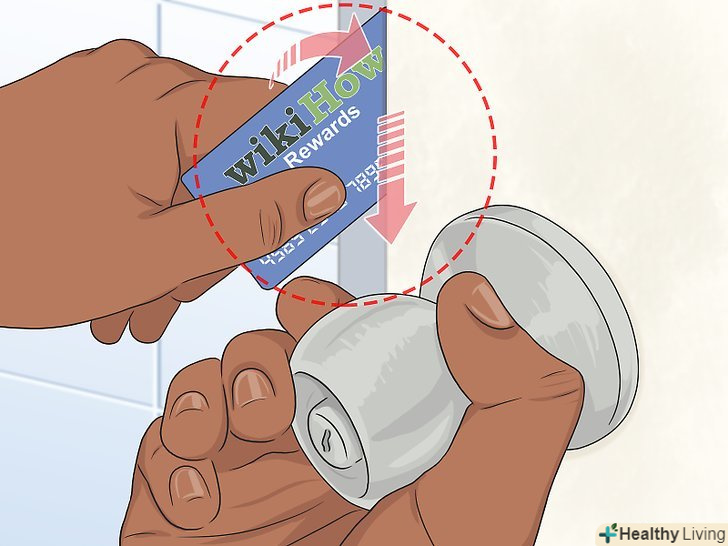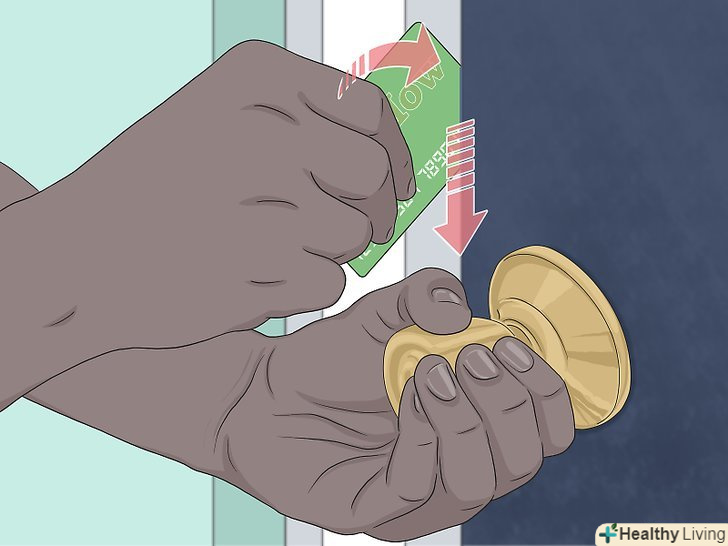 Вставте між дверима і косяком тонку пластикову карту. можна використовувати кредитну, ідентифікаційну або подарункову карту. Помістіть карту в щілину прямо над засувкою і нахиліть вниз. Повільно повертайте ручку і намагайтеся підчепити засувку картою. [9]- Можливо, у вас вийде не з першої спроби. Ваше завдання-розімкнути замок, повернувши ручку і висунувши засувку картою з отвору в косяку. [10]