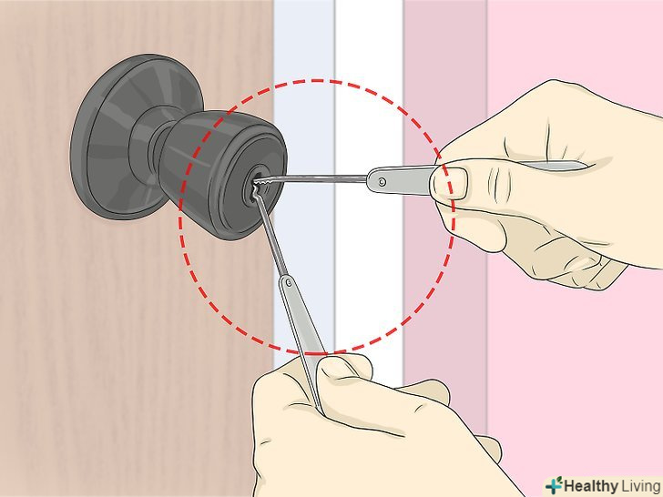Розкрийте замок набором відмичок, якщо він у вас є. якщо двері в туалет постійно зачиняються, можливо, Вам варто придбати набір відмичок. Дотримуйтесь інструкції по застосуванню для вашого набору, щоб підібрати підходящу відмичку для розтину замка дверей в туалет. [6]- Набір відмичок можна замовити в інтернет-магазинах.