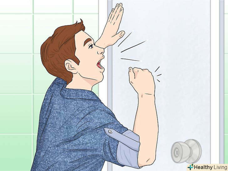 Покличте на допомогу людей, які можуть перебувати поблизу. якщо ви застрягли у вбиральні в людному будинку, це найпростіший спосіб відкрити двері. Покличте на допомогу. Скажіть, що ви застрягли. Якщо ніхто вас не чує, спробуйте постукати об стіну яким-небудь предметом, наявними в кабінці, наприклад сміттєвим відром. [8]- Відкрити замкнені двері зовні набагато простіше, ніж зсередини, тому що навколо багато людей, до яких можна звернутися за допомогою. Також зовні легше знайти потрібні для розтину замка інструменти.