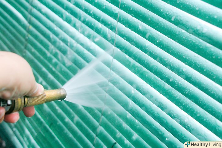 Вимийте жалюзі на вулиці. дуже брудні жалюзі можна відмити на вулиці використовуючи шланг. Викладіть жалюзі на плити або килимок. Налийте у відро мильної води. Використовуйте щітку або губку, щоб очистити жалюзі з обох сторін. Візьміть садовий шланг для полоскання жалюзі з обох сторін. Витріть рушником і повісьте їх назад.