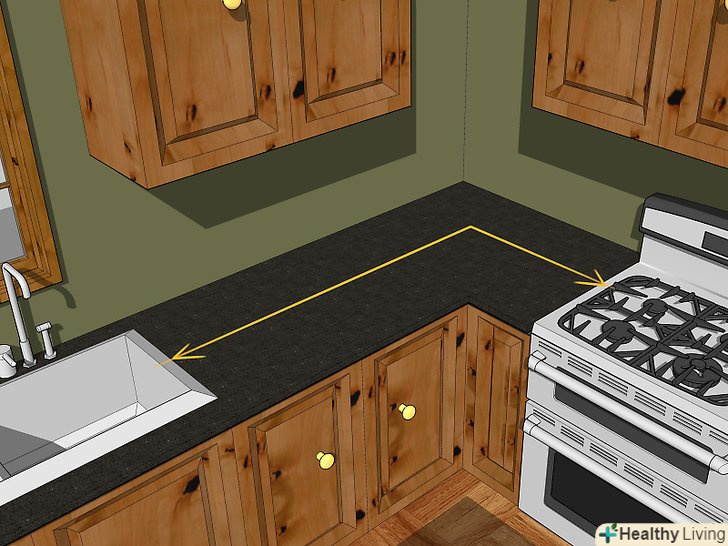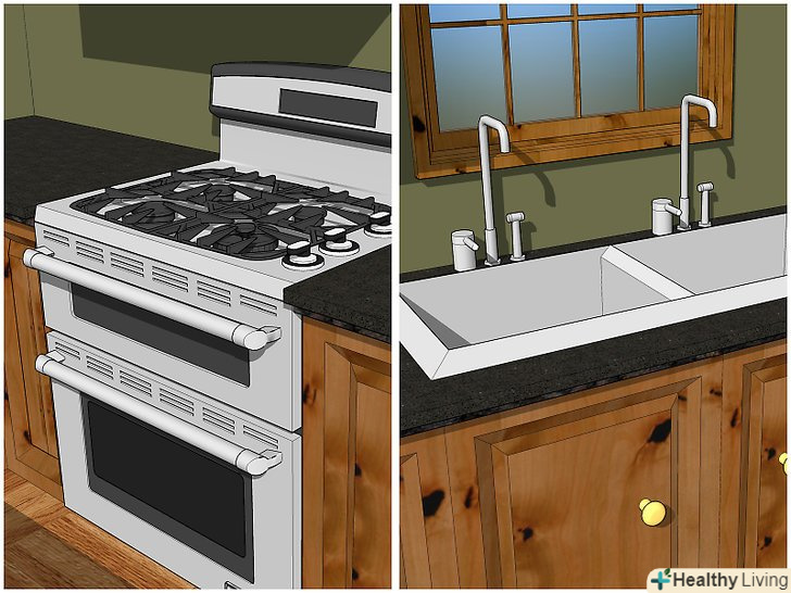 Почніть з розташування великих приладів і раковини. можливо, ви будете обмежені у виборі місця для великих приладів. Обов'язково визначте спочатку місця для великих приладів. Їх місце розташування має працювати на вас.- Наприклад, плити і печі необхідно буде розміщувати в залежності від доступності газу, раковину - в залежності від розташування труб і т. д.