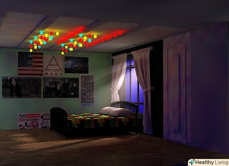 Подумайте про освітлення в кімнаті. кімнати на фото користувачів Tumblr часто мають нетрадиційне освітлення (для більшого ефекту). Нерідко кімнати висвітлюються новорічними електричними гірляндами, світлодіодними смугами, декоративними підвісними лампами, щоб освітлення надавало кімнаті додатковий затишок. Ви можете зробити декоративну лампу зі звичайної, наприклад, використавши незвичайний абажур.- Кім збирається повісити новорічну електричну гірлянду над узголів'ям свого ліжка; це прикрасить кімнату і, більше того, Кім може використовувати світло від гірлянди для читання в ліжку. Також Кім збирається поставити старовинну лампу на свою тумбочку, щоб додати кімнаті чарівності старовини.
