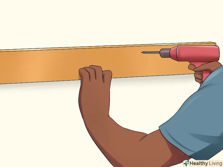 Прикріпіть монтажні планки до стіни. притисніть планку до стіни і вирівняйте її низ з другим набором ліній. Нижній край кожної планки повинен вирівнятися уздовж вершини другої лінії. Використовуйте рівень, щоб верхня планка стояла абсолютно горизонтально зліва-направо, а бічні – ідеально вертикально зверху-вниз.- Просвердлите отвори в стіні через планки. Переконайтеся, щоб кожне отвір було просвердлено в центрі стійок, зазначених раніше. Якщо не хочете свердлити отвори, можете просто прибити кріпильні планки до стійок.