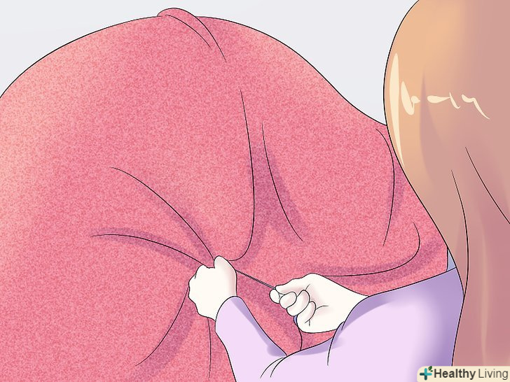 Прикріпіть гудзик. Ви можете зробити це за допомогою одного або двох просвердлених отворів, в залежності від того, який варіант ви вирішили використовувати. Не важливо який варіант ви вибрали, переконайтеся що ви щільно притягнули гудзик для створення хвилястого ефекту на Ватині. Для цього існує два методи.- Якщо ви використовуєте метод з двома отворами, то потрібно протягнути голку в другий отвір в гудзику. Потім протягнути голку через другий отвір у фанері і натягнути нитку. Після цього протягнути голку з ниткою через обидва отвори ще кілька разів і міцно зав'язати нитку.