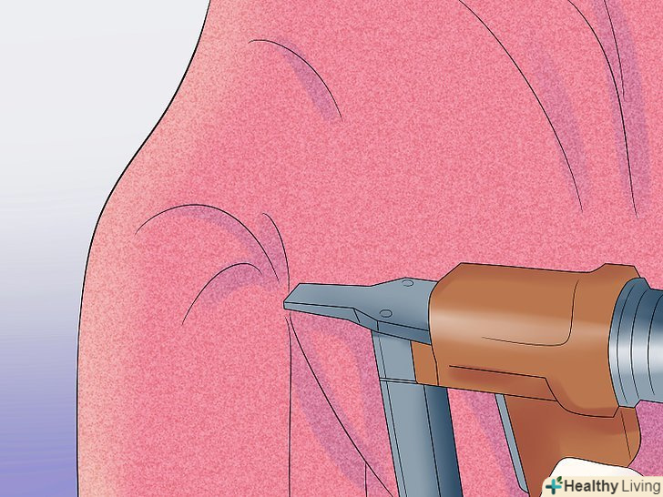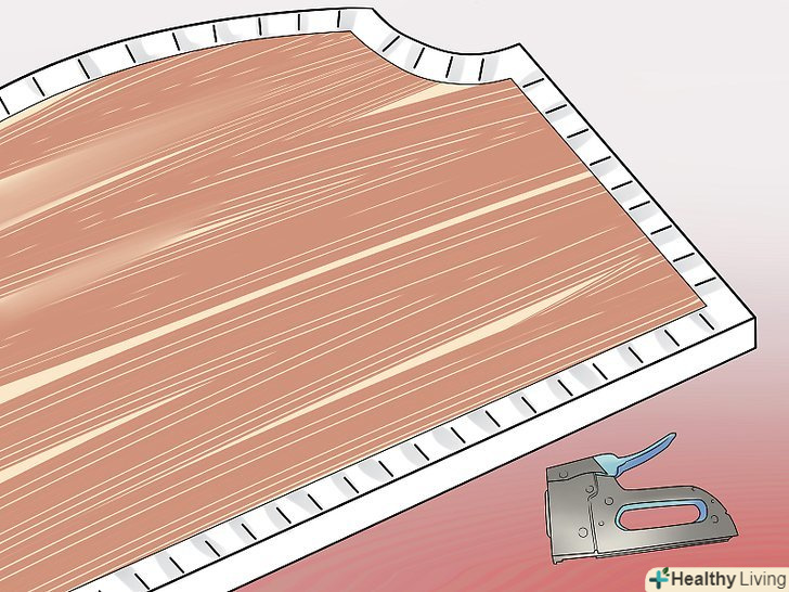 Щільно натягніть тканину і прикріпіть її за допомогою будівельного степлера до фанери. тканина повинна повністю закривати ватин на задній стороні узголів'я. Коли тканина буде повністю закріплена, відріжте її надлишки за допомогою ножиць.