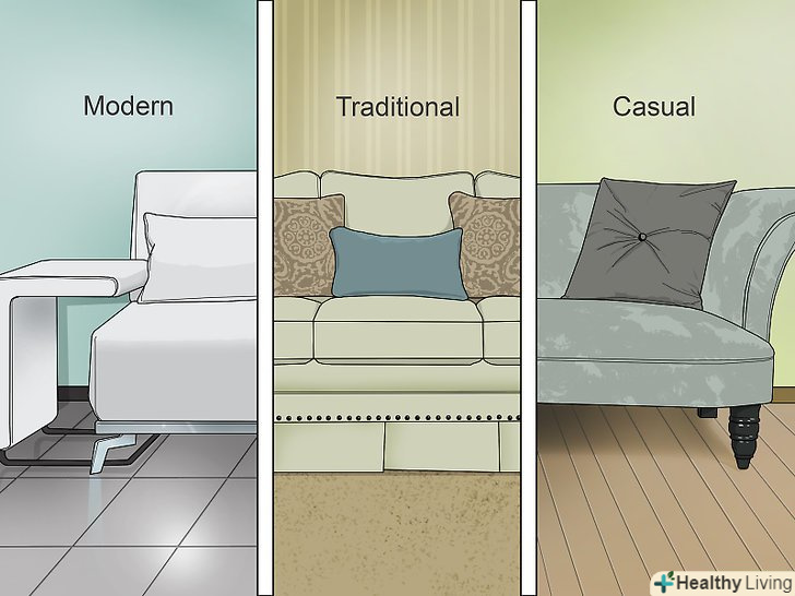 Дотримуйтесь загального стилю. кожен елемент інтер'єру повинен доповнювати інші, інакше у вітальні оселиться хаос еклектики. Дотримуйтеся одного дизайнерського стилю, щоб елементи не виглядали накиданими на купу. Ви можете вибрати будь-який стиль (модерн, кантрі, класичний і так далі), але всі елементи повинні йому відповідати.