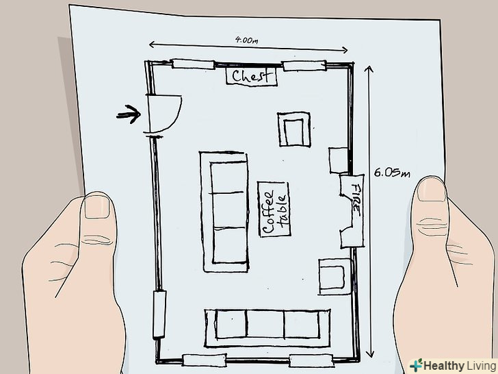 Спроектуйте розташування в кімнаті. Після завершення креслення, позначте на підлозі кілька ліній за розмірами передбачуваної меблів. Завдяки цьому легше візуалізувати майбутню розстановку. Використовуйте паперовий скотч або розкладіть листи газет.