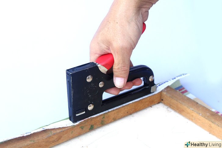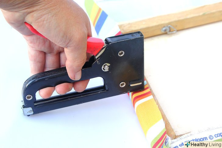 Скріпіть скобами протилежні сторони. почніть з центру лівого боку, потім тугіше натягніть тканину і скріпіть тепер з центру правого боку. Продовжуйте таким же чином накладати скоби по черзі на ліву і праву сторони, натягуючи тканину перед кожним ударом степлера.- Виконуйте цю операцію рухаючись у напрямку від центру до країв полотна.