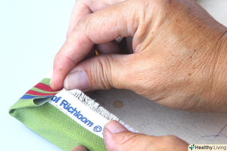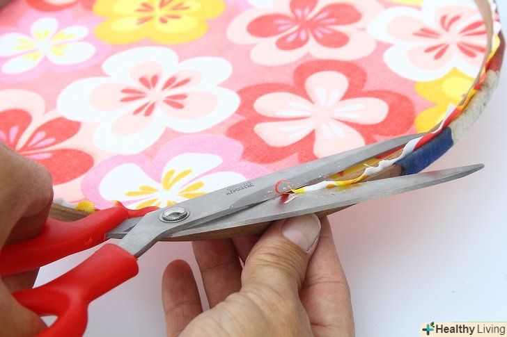 Обріжте тканину. зріжте її так, щоб не було видно з лицьового боку п'яльців зайві кінці тканини.- Переконайтеся, що максимально обрізали зайву тканину, інакше вона буде тріпатися кожен раз, коли торкаєтеся до п'яльців. Якщо це неможливо, промажте краю тканини спеціальним гелем від розповзання тканини.