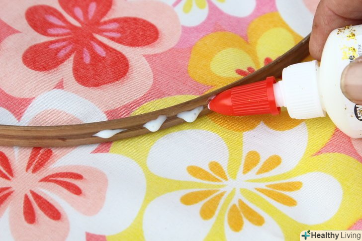 Нанесіть клей на зворотну сторону п'яльців. загорніть тканину, склавши її виворітні сторони один з одним. Нанесіть клей ПВА на задню сторону внутрішнього кільця п'яльців.- Можете також використовувати гарячий клей або клей для тканини.