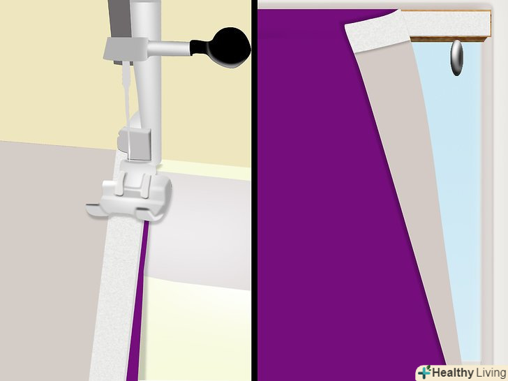 Прикріпіть клейку стрічку до тканини. відступите 2,5 см від верху штори з виворітного боку. Прошийте легким стібком.- Легким стібком пройдіться по тканині і клейкою стрічці, тим самим, об'єднавши їх.