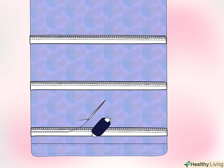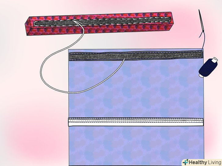 Вставте рейку між тканиною і підкладкою і проштовхніть до самого зшитого низу. зшийте матерію, щоб планка залишалася на місці; це можна зробити або руками, або за допомогою швейної машини.- Для цих штор спробуйте використовувати лапку для вшивання блискавки і шийте машинкою. Це найбільш складний крок (якщо працювати машинкою), оскільки під час шиття, ви повинні знаходитися на достатній відстані від стіни, щоб пристосувати рейку, яка буде стирчати спереду і позаду вас. Ручне шиття зніме подібну проблему, але займе більше часу.