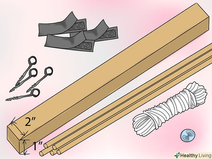 Візьміть дошку розміром 2,5 см x 5 см - виміряйте і виріжте планку під розмір внутрішньої ширини вікна (наша була 116 см), стрижні, шурупи, застібки на липучці, нейлоновий шнур і підвісний шнур.